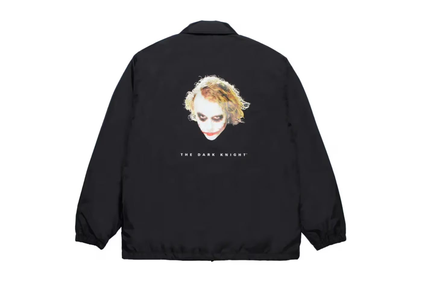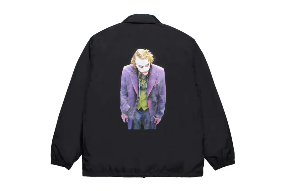 WACKO MARIA представил новую коллекцию Fall/Winter 2025 в сотрудничестве с трилогией «Тёмный рыцарь», продолжая тему, начатую весной 2025-го года. Основной акцент — на образе Джокера, сыгранного Хитом Леджером. В коллекции есть coach-куртки с пуговицами и карманами, в цветах серый и чёрный, на спине — либо полный портрет Джокера, либо его крупный фрагмент с надписью THE DARK KNIGHT, а спереди — логотип WACKO MARIA.